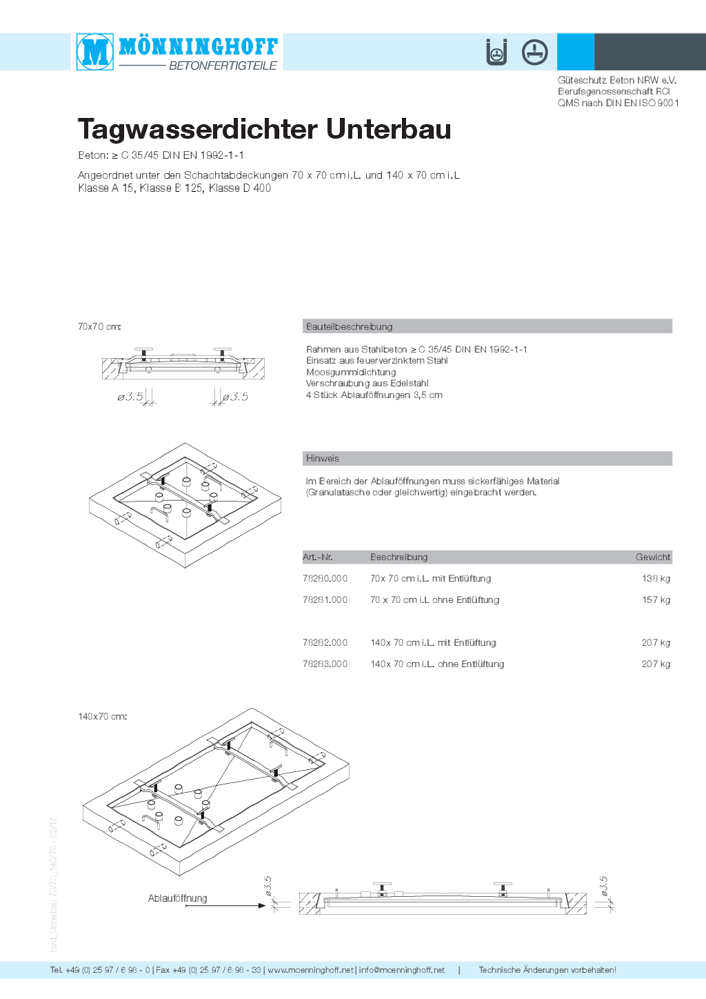 Tagwasserdichte Abdeckungen sollen das Eindringen von Oberflächenwasser in den Schacht verhindern. Diese Eigenschaft wird nur durch den Außenrahmen (AR) erreicht. Das bedingt einen sorgfältigen, sauberen Einbau. Seitliche Öffnungen in den Ecken des AR dürfen nicht angepflastert, angeteert oder einbetoniert werden, sonst entfällt die twd.- Eigenschaft. Die Eckenöffnungen sind bauseits an Sickerleitungen anzuschließen. TWD- Abdeckungen dürfen nicht in Senken eingebaut werden.