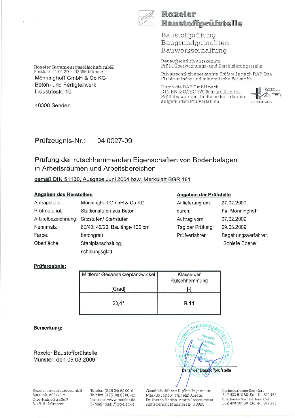 Rutschhemmenden Eigenschaften Prüfzeugnis Nr.: 070044-05 15527