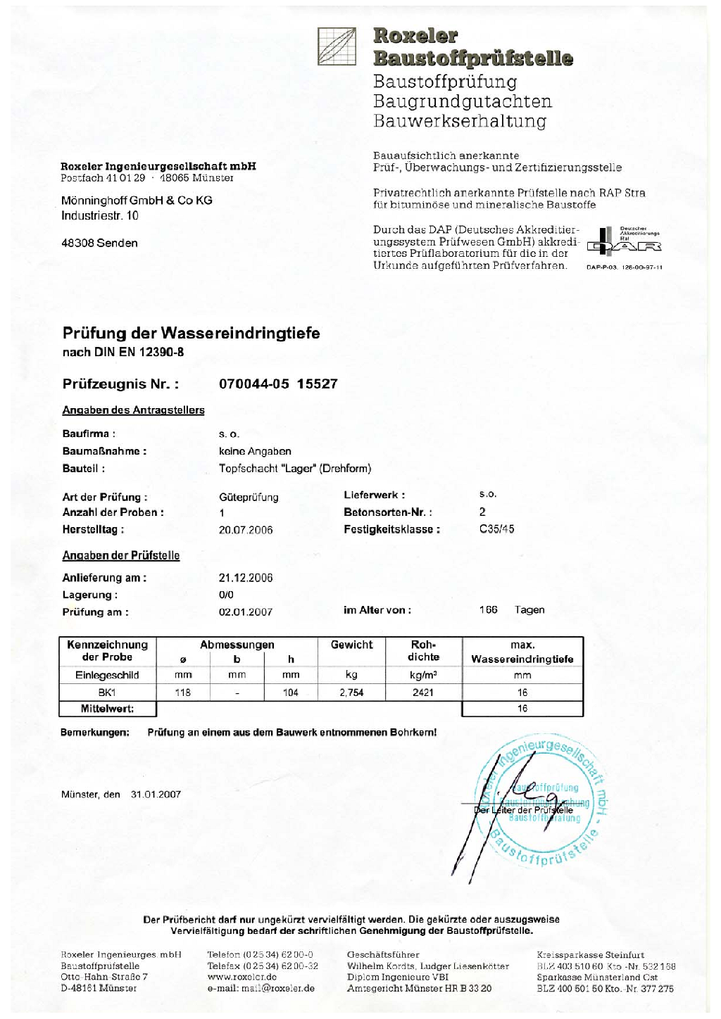 Wassereindirngtiefe Prüfzeugnis Nr.: 070044-05 15527